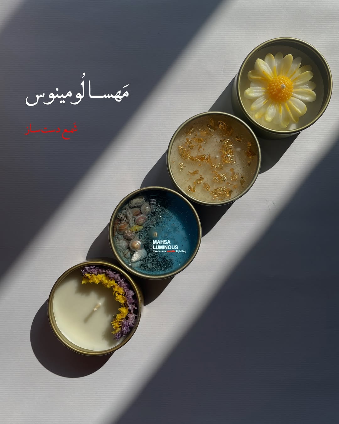 روشنایی طبیعی در قوطی فلزی شمع گیاهی با ابعاد ۲۶/۵ سانتیمتر، قابل در چهار طرح: مارگریت طلایی دریایی گل رنگ قوطی مشکی /طلایی /نقره ای